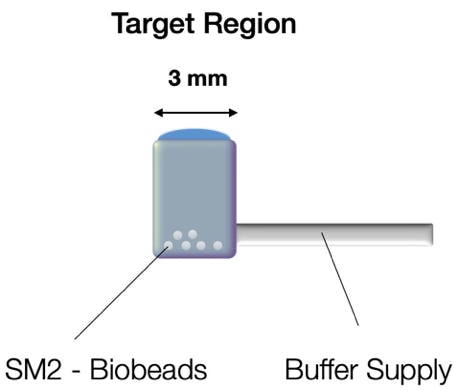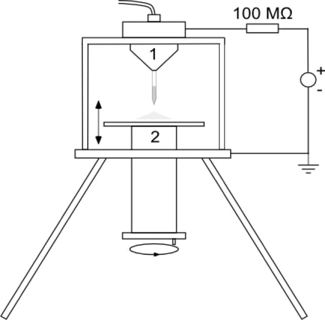 A nano-electrospray emitter is directed towards the liquid surface of a small container filled with buffer solution. The container is connected to a larger buffer reservoir to compensate for losses by evaporation.