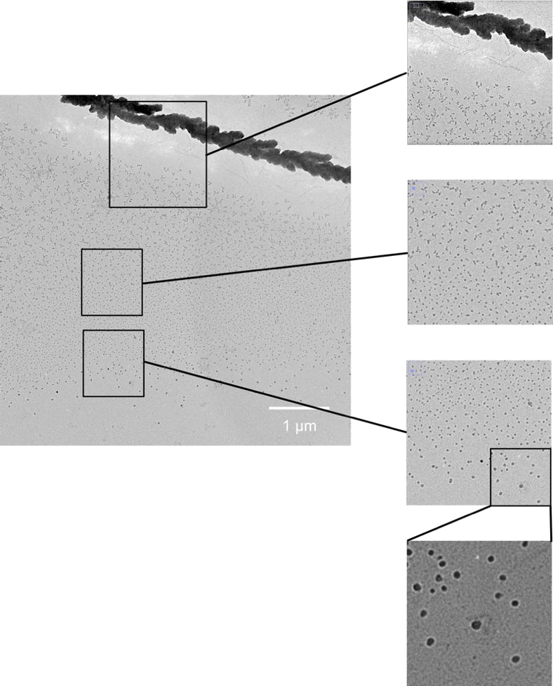 Transmission electron microscopic picture of an listeriolysin sprayed membrane. Uranyl acetate solution was used to generate contrast.