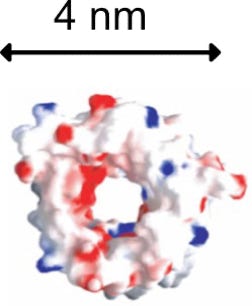 The first protein used was the monomeric channel protein ompG. The molecular structure for ompG predicts that a membrane with ompG channels would show 4 nm wide pores. The transmission electron microscopic picture of the membrane preparation shadowed with platinum showed such a layer extended over the entire 3 mm wide preparation area.