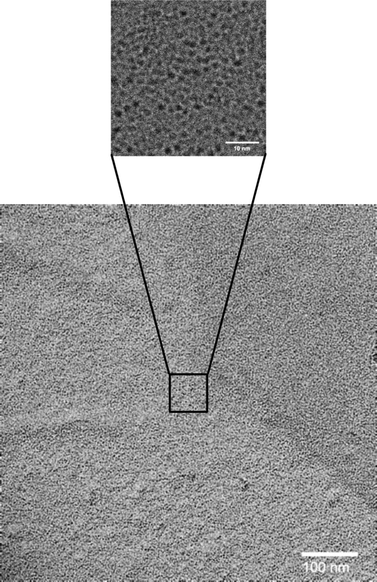 The first protein used was the monomeric channel protein ompG. The molecular structure for ompG predicts that a membrane with ompG channels would show 4 nm wide pores. The transmission electron microscopic picture of the membrane preparation shadowed with platinum showed such a layer extended over the entire 3 mm wide preparation area.